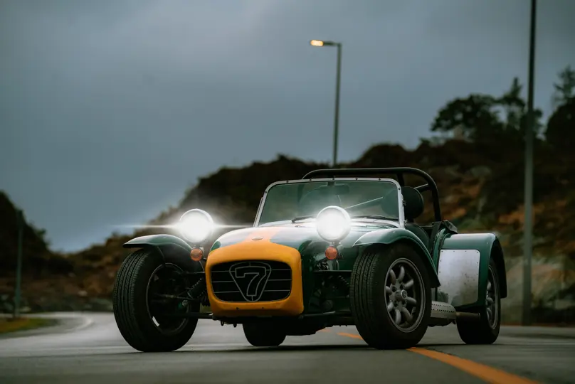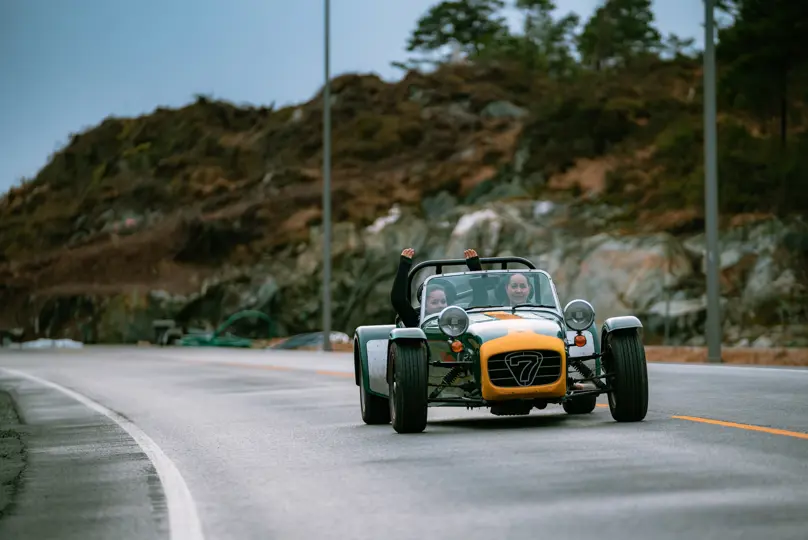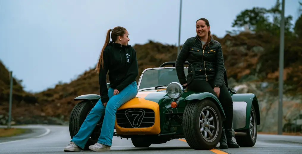 Lotus Seven er jo ikke et vanlig syn på vestlandsveiene så Stine er vant med at folk snur seg etter den når de kjører forbi.
